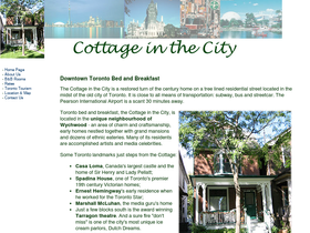 91%the cottage in the city is a restored turn of the century home in downtown toronto. located on a tree lined residential street in the unique neighbourhood of wychwood, it is close to all means of transportation: subway, bus and streetcar. the pearson international airport is a scant 30 minutes away.