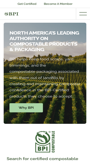 Biodegradable Products Institute provides certification services for compostable products. BPI-certified products meet ASTM D6400 or D6868 testing standards to certify they will biodegrade in a managed compost facility.