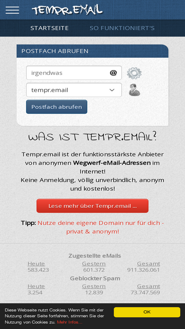 83%wegwerf-email adresse zum versenden und empfangen von einmal-email nachrichten. kostenlose fake-email adressen mit dateianhängen abrufen und verschicken. keine registrierung der trash-mail adresse notwendig.