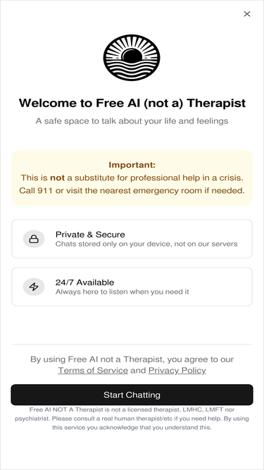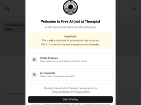 96%Free AI (not a) Therapist is an AI self-help, mental health chatbot to talk to about your life and problems without judgement, so you can live your life to its fullest. Free AI (not a) Therapist is not a licensed therapist, LMHC, LMFT nor psychiatrist.