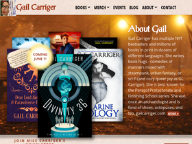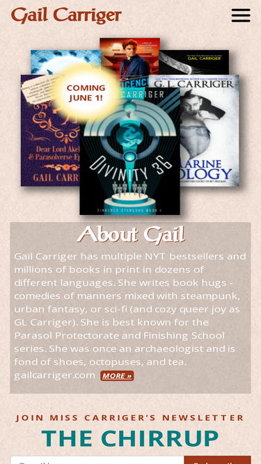 93%nyt bestselling author gail carriger: comedic, urban fantasy, steampunk, historical, romance, mystery, queer joy, heroine's journeys, and more sub-genres than one can shake a parasol at. books include soulless, etiquette & espionage, and prudence.