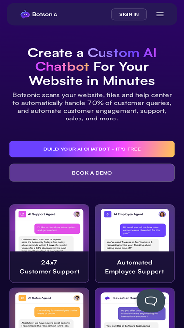 90%See Botsonic’s AI Agents in action. Request a demo to automate your customer support, employee experience and commerce.