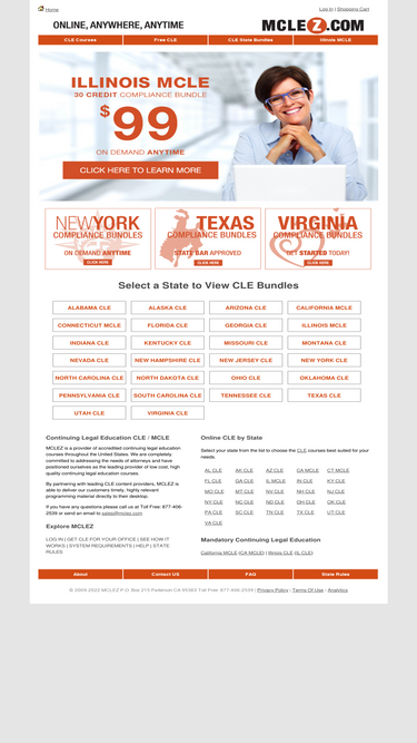 86%mclez - online continuing legal education (cle) | mcle. continuing legal education accredited for the following states: alabama cle, alaska cle, arizona cle, california cle, colorado cle , florida cle, illinois cle, indiana cle, mississippi cle , missouri cle , nevada cle, new hampshire cle, new jersey cle, new york cle , north carolina cle, oklahoma cle, south carolina cle , tennessee cle, texas cle, utah cle, vermont cle, virginia cle , washington cle, west virginia cle