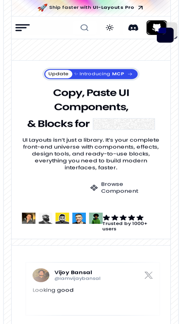 97%Beautifully designed React + Next.js + TailwindCSS components. 60+ ready-to-use, accessible, and customizable UI pieces — open source and free.