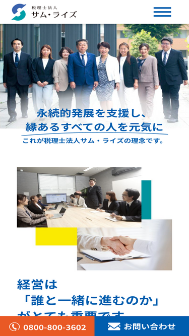 100%このページは、【全国対応】埼玉県川越市の税理士法人サム・ライズの公式ホームページ総合TOPです。サム・ライズが強みとしている、「無申告解消」「税務調査」「相続税対応」「法人設立」をはじめ、提供しているサービスについて、その特徴や対応地域、価格等について記しています。加えて、 サム・ライズの「想い」や「事例」のご紹介や、皆さまの「税」に関する悩みにお応えする「税務や税理士、会計に関する記事」「セミナー情報」「動画」もご提供しています。