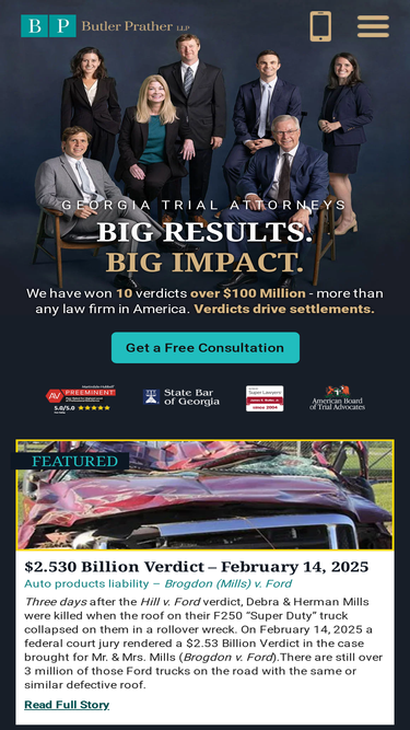 100%Butler Prather LLP are exceptional Georgia trial attorneys with consistent and proven results. Call our Georgia personal injury legal team now at (404) 321-1700.