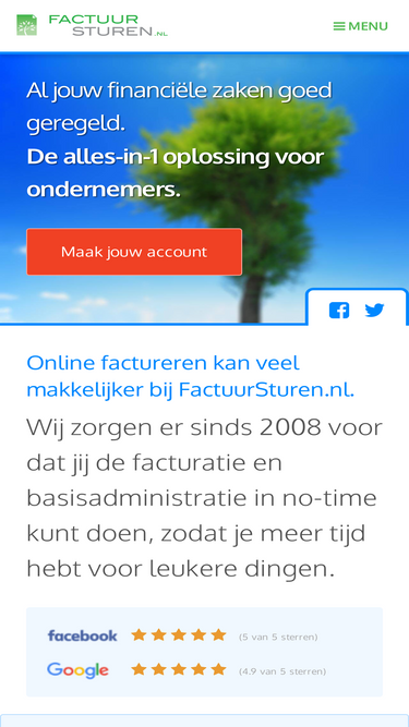 92%Al jouw financiële zaken goed geregeld voor een eerlijke prijs met FactuurSturen.nl. De alles-in-1 oplossing voor ondernemers.