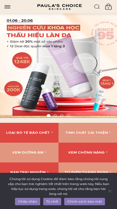 96%Paula's Choice - Vẻ đẹp bắt đầu từ sự thật. Là thương hiệu mỹ phẩm chăm sóc da hiệu quả, Không có hương liệu và không gây kích ứng da. Paula's Choice với các sản phẩm trị mụn trứng cá, kem dưỡng ẩm, chống nắng, chống lão hóa, loại bỏ da chết và nhiều sản phẩm khác
