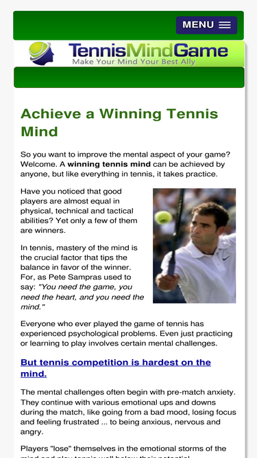 89%overcome the most challenging aspects of the mental game of tennis. tennismindgame.com provides deep insights of tennis psychology and makes your mind your best ally while battling it out in a tennis match.