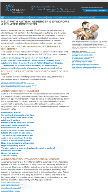 96%over 350 fact sheets for parents on autism, aspergers syndrome, pdd-nos and other related disorders, on diagnosis, interventions, behavioral strategies, personal stories and more.