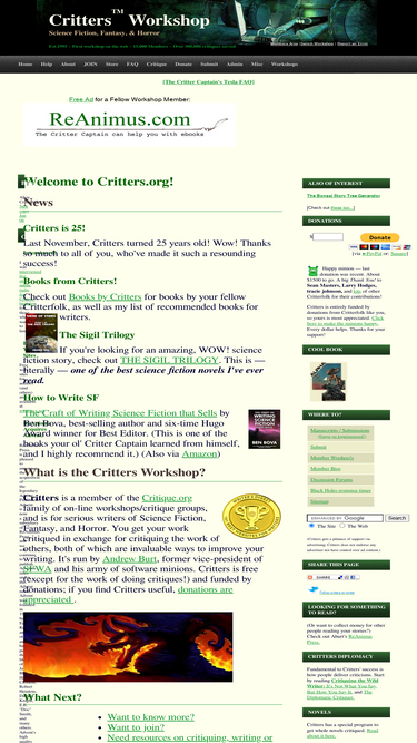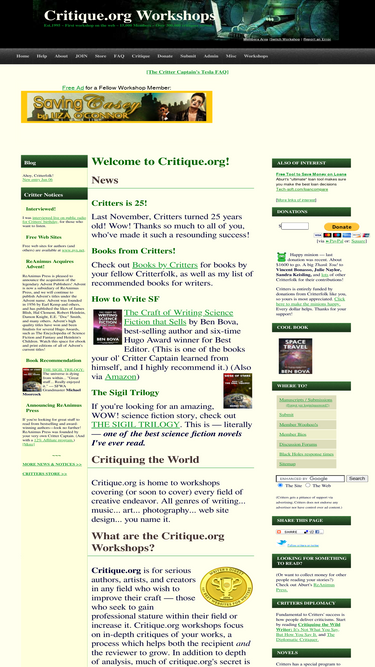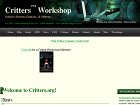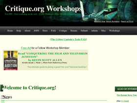 74%critique.org is an on-line workshop/critique group for serious writers, singers, musicians, songwriters, filmmakers, photographers, artists, web developers, app developers, etc. - think of an online creative writing course (or online songwriting course, singing course, photogrphy course, film course, etc.). critters is the on-line workshop/critique group for serious science fiction/fantasy/horror writers.