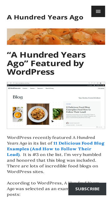 76%NEWSPAPER AND BLOG ARTICLES ABOUT A HUNDRED YEARS AGO 11 Delicious Food Blog Examples (And How to Follow Their Lead) (A Hundred Years Ago is #3 on the list.) – Wordpress.com Blog, October 28,…