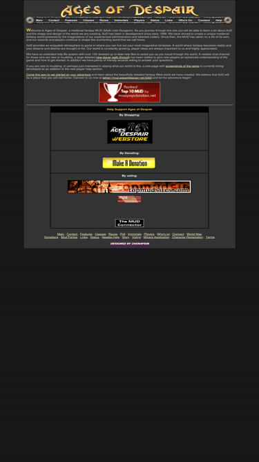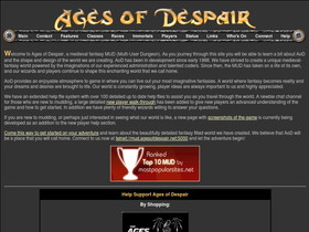 100%ages of despair is an exciting realm of fantasy and adventure. aod is an lp mud with high quality standards and vivid descriptions that are truly enchanting. we offer a medieval-fantasyenvironment to game in, with a large range of player races to choose from!