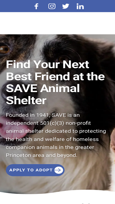 94%Find Your Next Best Friend at the SAVE Animal ShelterFounded in 1941, SAVE is an independent 501(c)(3) non-profit animal shelter dedicated to protecting the health and welfare of homeless companion animals in the greater Princeton area and beyond. Apply to Adopt Become a Part of the SAVE Family Adopt a Dog View all of our