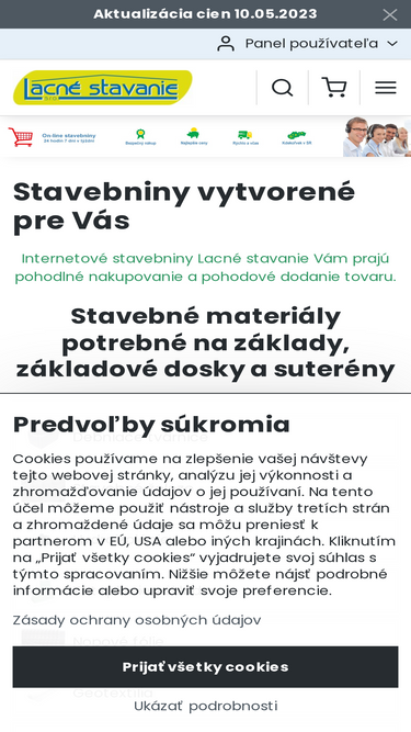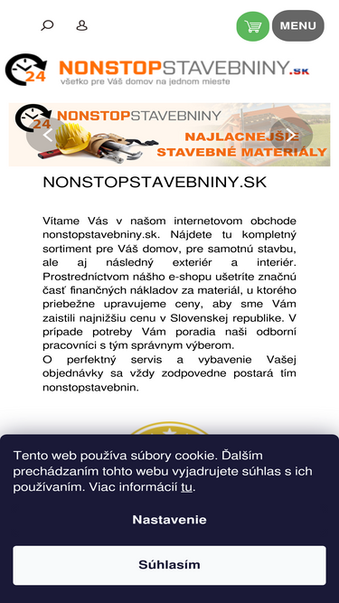 71%NONSTOPSTAVEBNINY.SK. Vítame Vás v našom internetovom obchode NONSTOPSTAVEBNINY.SK Nájdete tu kompletný sortiment pre Váš domov, pre samotnú stavbu, ale aj následný exteriér a interiér. Prostredníctvom nášho e-shopu ušetríte značnú časť finančných nákladov za materiál, u ktorého priebežne upravujeme ceny, aby sme Vám…