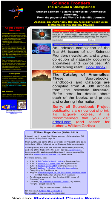 73%science frontiers publishes catalogues of anomalies in the sciences, and a newsletter of strange phenomena. over 2000 reports available free online.