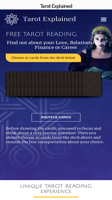 Welcome toTarot-Explained.com! Find out more about tarot cards, tarot decks, spreads and their meanings. Try your free reading now!