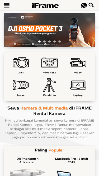 iframe rental kamera merupakan tempat persewaan peralatan fotografi dan video terfavorit di jogja. kami menyediakan kamera dslr, lensa, mirrorless, kamera video, handycam, tv, laptop, audio, proyektor dan masih banyak lagi. | sewa kamera dan multimedia jogja