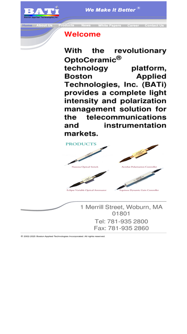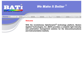 67%boston applied technologies, inc. provides a complete light intensity and polarization management solution for the telecommunications and instrumentation markets, with the revolutionary optoceramic platform. the major products of bostona applied technologies include fast variable optical attenuator (voa), polarization transformer (pc), ultra-fast optical switch and advanced functional materials.