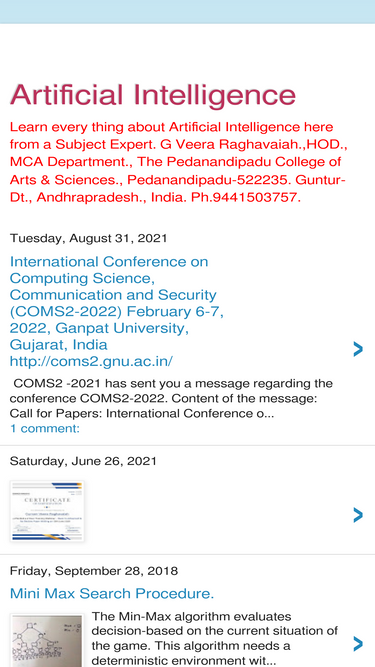 64%Learn every thing about Artificial Intelligence, Here from a Subject Expert. Dr. G Veera Raghavaiah., Associate Professor /HOD., MCA Department., The Pedanandipadu College of Arts & Sciences., Pedanandipadu-522235. Guntur-Dt., Andhrapradesh., India. Ph.9441503757.
