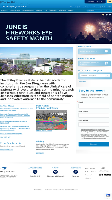 96%the shiley eye institute is the only academic institution in the san diego area with comprehensive programs for the clinical care of patients with eye disorders, cutting edge research on surgical techniques and treatments of eye diseases, education in the field of ophthalmology and innovative outreach to the community.