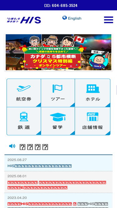 エイチ・アイ・エス カナダではカナダ発の旅行・ツアー・ホテル・格安航空券を取り扱っている旅行会社です。 バンクーバーとトロントに支店があり、 オンラインで航空券やホテル・ツアーの予約も可能です。 旅行のことなら、his カナダ支店へ