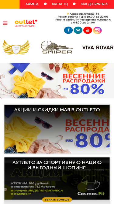 Торговый центр Аутлет включает в себя более 50 магазинов одежды, обуви, белья, детских игрушек, гипердискаунтер Копилка. Скидки и акции каждую неделю, удобное расположение