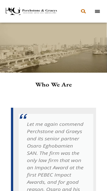 79%https://perchstoneandgraeys.com/wp-content/uploads/2025/06/PG-Video-cut.mp4#t=,65 Technology Disrupts We see the Opportunities About Us Who We Are Let me again commend Perchstone and Graeys and its senior partner Osaro Eghobamien SAN. The firm was the only law firm that won an Impact Award at the first PEBEC Impact Awards, and for good reason. Osaro and his team have offered their […]