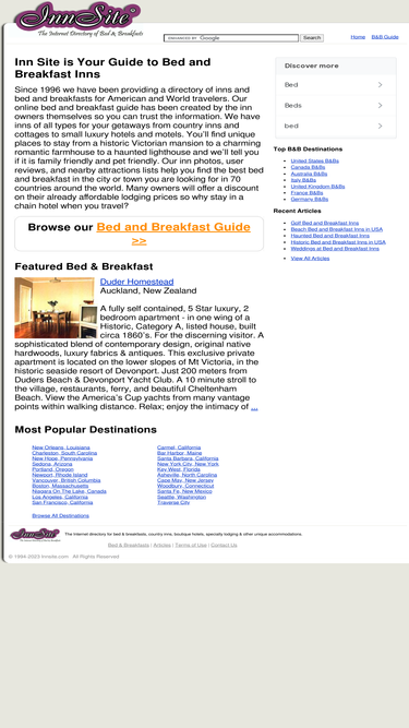 77%since 1996 we have been providing a free directory of inns and bed and breakfasts for american and world travelers. our online bed and breakfast guide has been created by the inn owners themselves so you can trust the information.