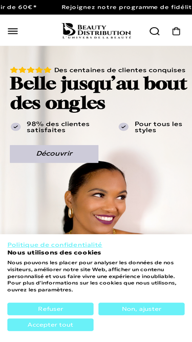 98%Explorez notre univers de beauté chez Beauty Distribution, où l'onglerie, le maquillage, le soin et une gamme diversifiée de produits se rencontrent pour sublimer votre beauté naturelle. Trouvez tout ce dont vous avez besoin pour exprimer votre style avec éclat et authenticité.