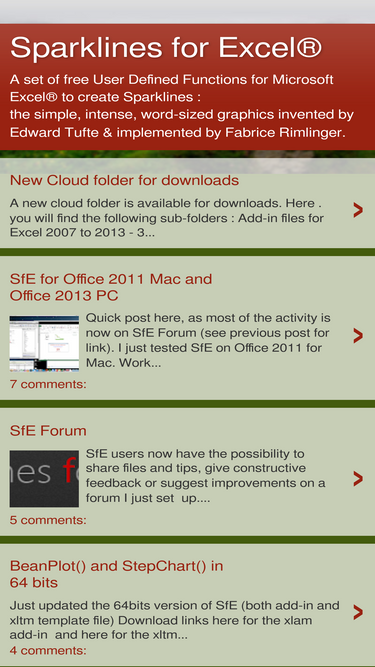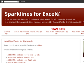 98%A set of free User Defined Functions for Microsoft Excel® to create Sparklines : the simple, intense, word-sized graphics invented by Edward Tufte & implemented by Fabrice Rimlinger.