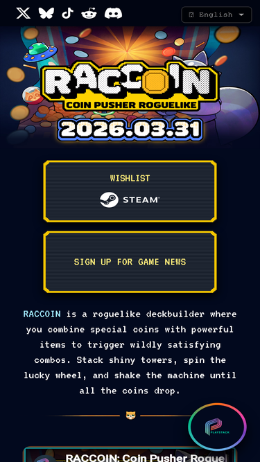 85%RACCOIN, inanılmaz derecede tatmin edici komboları tetiklemek için özel jetonlar ile güçlü öğeleri birleştirdiğin roguelike türünde bir deste oluşturma oyunudur. Parıl parıl jeton kuleleri oluştur, şanslı çarkı çevir ve tüm jetonlar patır patır yağana kadar makineyi salla.