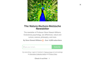 100%The newsletter of Professor Steve Stewart-Williams. Evolutionary psychology, sex differences, nature and nurture, science, philosophy, and more. Click to read The Nature-Nurture-Nietzsche Newsletter, by Steve Stewart-Williams, a Substack publication with tens of thousands of subscribers.