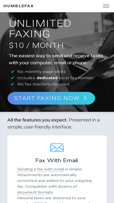 100%humblefax is an unlimited online faxing service that makes your fax machine obsolete. you can use a real dedicated phone number to receive faxes into your email inbox and send faxes by attaching your documents (such as pdf or .doc) to an email. humblefax was designed from the ground up for simplicity and ease of use.