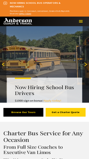 88%looking for a charter bus service company in pa, ohio, ny or surrounding areas? choose anderson for your coach bus service needs. our wide range of clean, safe vehicles, cutting edge technology, and professional drivers get you where you need to be!