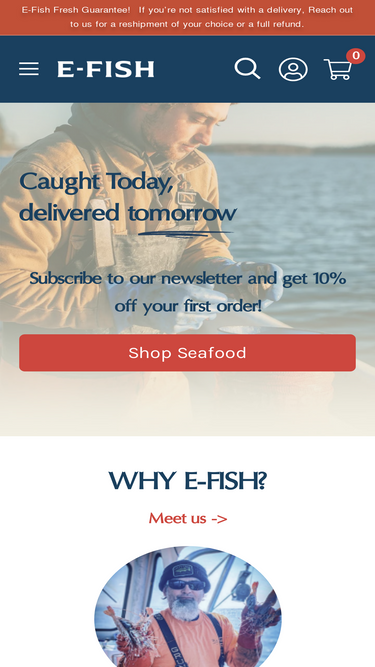 83%We take pride in supporting our customers through their seafood adventures and we do everything in our power to ensure your E-Fish customer service is an experience as amazing as the seafood we delivery. We do offer refunds in cases where the quality of product was compromised, but we do not accept returns. Reach out t