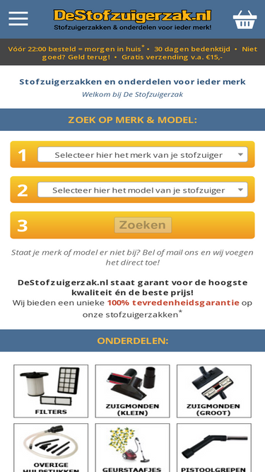 73%voor 22:00 besteld = morgen in huis • laagste prijs garantie • 100% tevredenheidsgarantie • stofzuigerzakken, filters en alle onderdelen voor jouw stofzuiger!