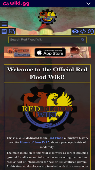 89%This is a Wiki dedicated to the Red Flood alternative history mod for Hearts of Iron IV, about a prolonged crisis of modernity. The main intention of this wiki is to work as sort of grouping ground for all lore and information surrounding the mod, as well as sort of introduction for new or just confused...