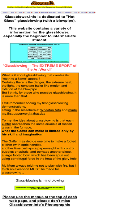 77%glassblower.info is dedicated to hot glass (off-hand / furnace) glassblowing with a blowpipe, and contains over 33,900 photos, instructional videos, web pages, and external links -- especially for the beginner to intermediate glassblowing student, to document various techniques and the "ballet of glassblowing".