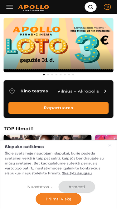 89%apollo kinas kino teatrai vilniuje ir panevėžyje. atrask naujausius filmus, repertuarą, bilietų kainas bei pasiūlymus. įsigykite bilietus jau dabar.