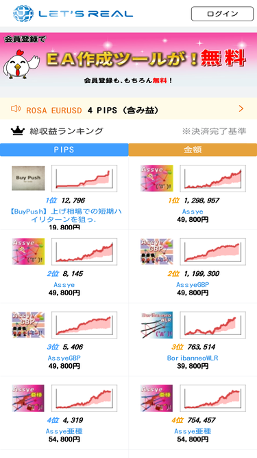 日本唯一のリアル口座の運用成績を公開しているEA販売サイト。FX初心者〜上級者までレッツリアルで自動売買(システムトレード)を始めた人が増えています。