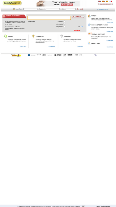 82%bookmyname est un bureau d'enregistrement de nom de domaine (registrar) agréé par l'icann pour l'achat de noms de domaine. enregistrer ou transférez un nom de domaine en fr, eu, be, es, ch, de, es, com, net, org, biz, info, mobi, name, paris, online, website, chez bookmyname.