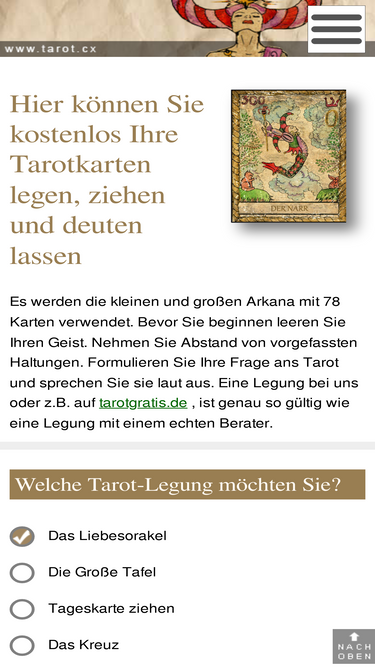94%Tarot und Erkenntnis. Karten legen, kostenloses Liebestarot und viele weitere Legesysteme, Tageskarten via E-Mail, einfühlsame Deutungen und bezaubernde Karten.