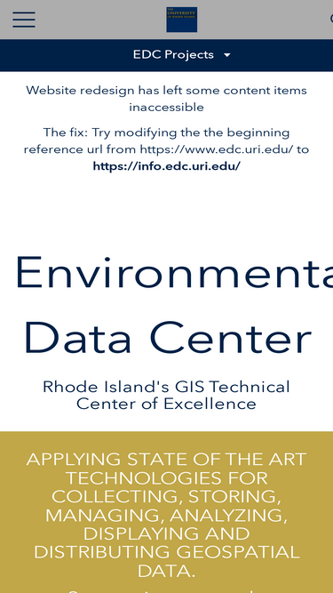 58%The Environmental Data Center at the University of Rhode Island is RI's GIS Technical Center of Expertise. Applying leading edge technologies for collecting, storing, managing, analyzing, displaying and distributing geospatial data.