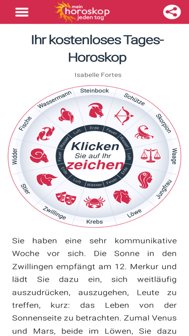 89%ihr horoskop kostenlos zu jedem sternzeichen. mit dem tageshoroskop, wochenhoroskop und vielen weiteren horoskopen für alle sternzeichen