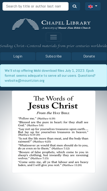93%our purpose is to humble the pride of man, exalt the grace of god in salvation, and promote real holiness in heart and life by distributing material from spurgeon, bonar, ryle, pink, and the puritans to churches, missions, schools, prisons, and individuals. chapel library sends christ-centered literature worldwide, relying entirely upon god’s faithfulness. we therefore do not solicit donations, but we gratefully receive support from those who freely desire to give.