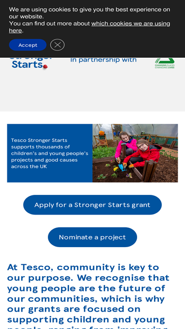 88%More information We welcome nominations from Tesco customers and colleagues, you can nominate local schools or projects for Tesco Stronger Starts and vote in-store for shortlisted projects. Do you know a local school or project that needs a bit of support? Let us know where it is and we’ll do our best to get in