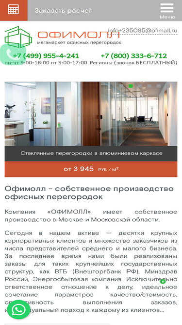 70%Производство и продажа всех видов офисных перегородок, дверей и офисной мебели. Компания «ОФИМОЛЛ» предлагает широкий выбор стационарных, мобильных и стеклянных перегородок