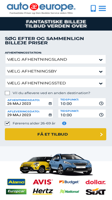 100%Find, sammenlign og book billig biludlejning verden over ved hjælp af 3 nemme trin! Du kan ståle på os, Auto Europe - Bedste priser og service siden 1954.
