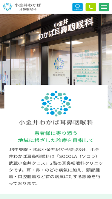 98%JR中央線・武蔵小金井駅から徒歩3分。小金井わかば耳鼻咽喉科は「SOCOLA(ソコラ)武蔵小金井クロス」2階の耳鼻咽喉科クリニックです。耳・鼻・のどの病気に加え、頸部腫瘍・口腔腫瘍など首の病気に対する診療を行っております。小金井市で耳鼻咽喉科をお探しなら 小金井わかば耳鼻咽喉科へ。